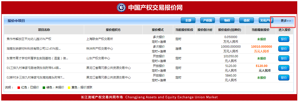 (1).請(qǐng)?jiān)诰W(wǎng)頁(yè)瀏覽器地址欄輸入:http://m.unclecosme.com(長(zhǎng)沙聯(lián)合產(chǎn)權(quán)交易網(wǎng)),進(jìn)入網(wǎng)站首頁(yè),在網(wǎng)頁(yè)中部“中國(guó)產(chǎn)權(quán)交易報(bào)價(jià)網(wǎng)”欄目點(diǎn)擊“更多”進(jìn)入。