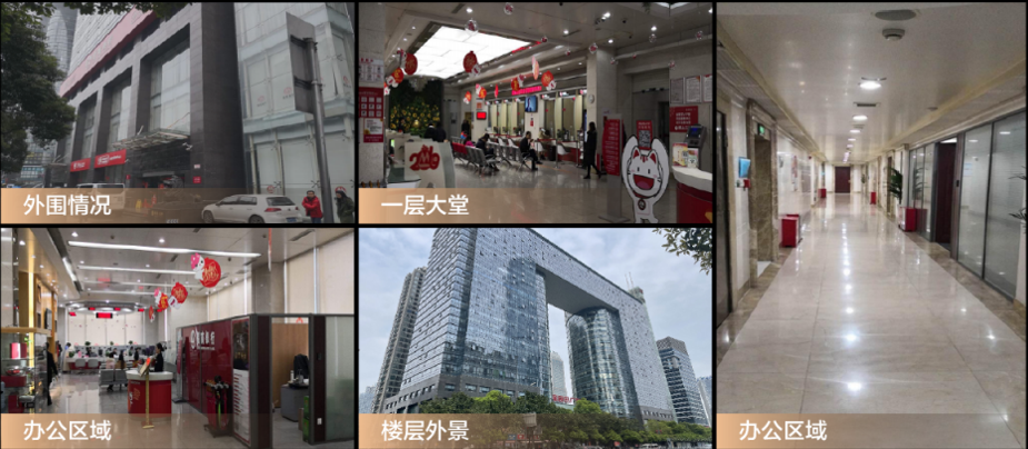 (二)標(biāo)的物內(nèi)部現(xiàn)狀: 1-7層可單獨(dú)安裝電梯;各公共區(qū)域裝修考究,室內(nèi)各硬裝燈具均全部保留,后期可實(shí)現(xiàn)直接入住辦公無需大規(guī)模改造,安裝電梯需辦理申請和許可手續(xù)。 1層目前租賃給招商銀行作為營業(yè)廳,租賃期限2022-2026年,租金380/元/平/月,年遞增4%。 2-3層為原金葵花客戶和高端客戶營業(yè)廳。 4層為原招商銀行長沙分行大型會議室、員工食堂、宴會廳、健身房等公共配套區(qū),同時(shí)包含少量辦公區(qū)域。 5-7層為原招商銀行長沙分行辦公區(qū)域,包含普通辦公區(qū)、高管辦公區(qū)等。 (三)品質(zhì)物業(yè)服務(wù): 綠城物業(yè),中國服務(wù)業(yè)500強(qiáng),中國物業(yè)服務(wù)百強(qiáng)滿意度領(lǐng)先企業(yè),以完善的服務(wù)體系和先進(jìn)的服務(wù)模式,致力于整體管理。 (四)標(biāo)的物業(yè)實(shí)景圖: