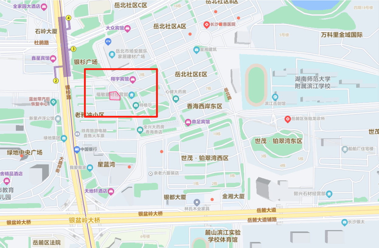 北臨銀岳路,西臨銀杉路,南臨岳麓大道,東臨岳北路 |